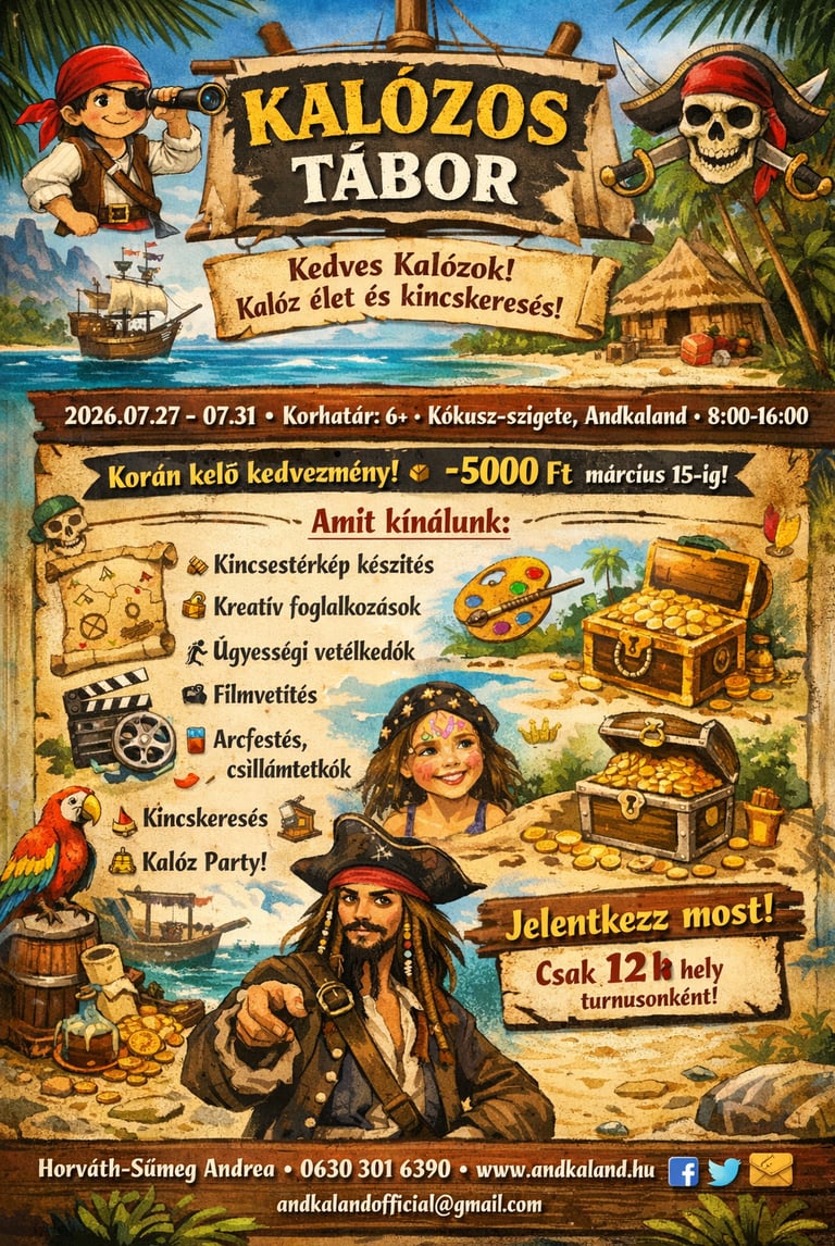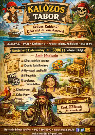 kincskeresés, térképkészítés, kalóztörténelem, kézműves foglalkozások, arcfestés/tetkózás, versenyek, kvíz, kalóz 7próba, (jó idő esetén strand, kalandváros).....